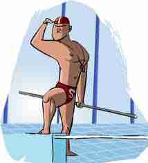 9. Le maître-nageur surveille des garçons qui jouent et sautent dangereusement dans l'eau.